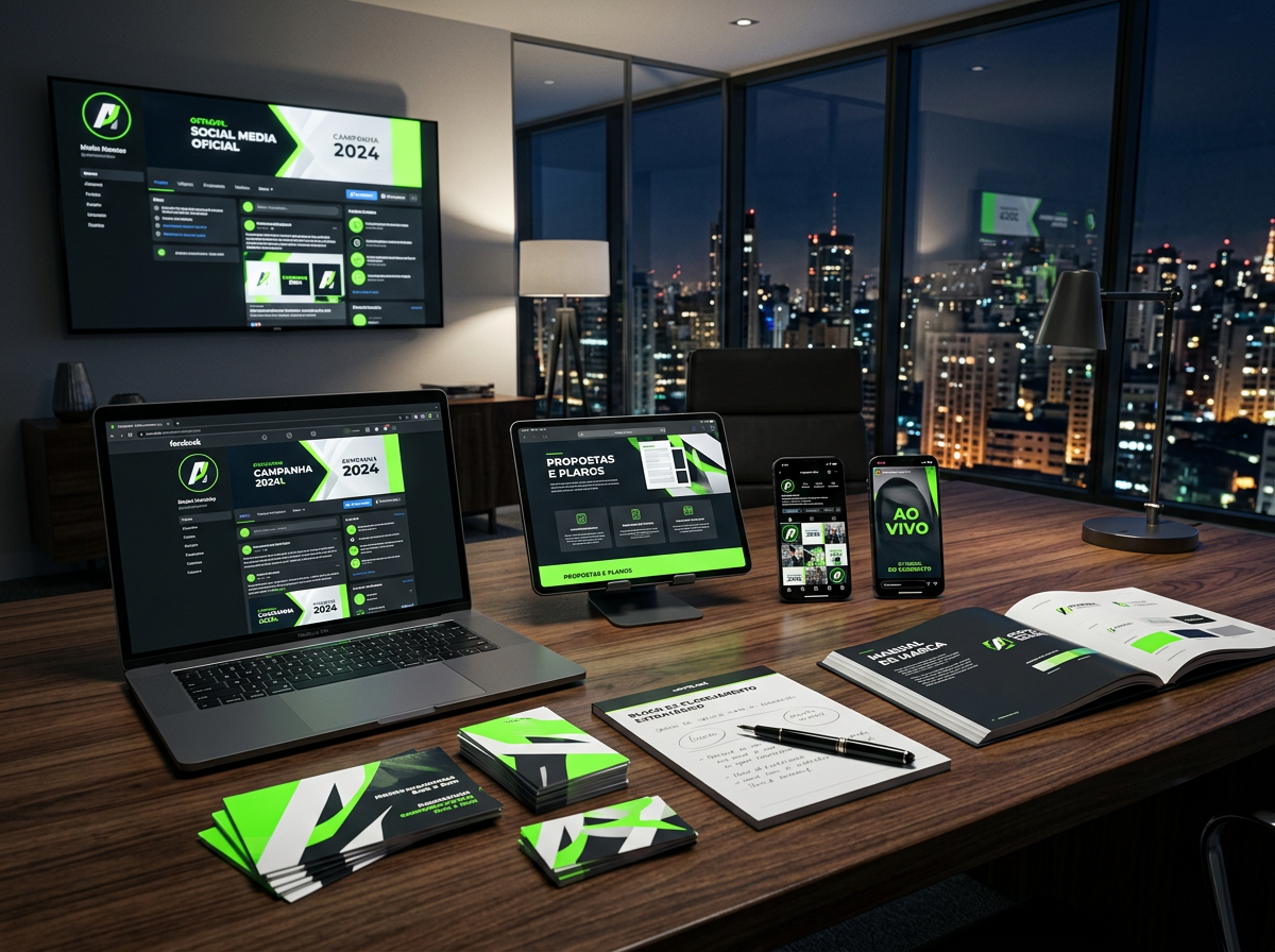 Identidade visual profissional e presença estratégica nas redes para fortalecer sua imagem pública e manter sua campanha ativa todos os dias.